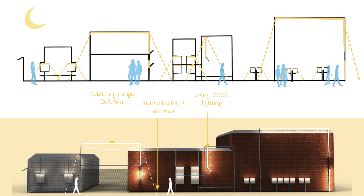 Lighting remains off during the day to save energy, while the space stays open and comfortable for pedestrians.