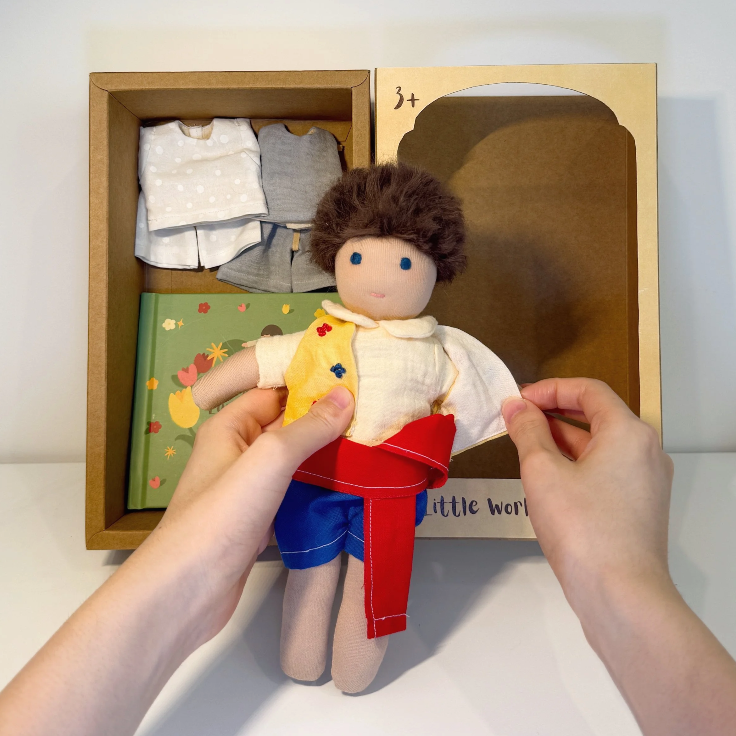 Each doll is handmade with 100% cotton, wool hair, and soft fabrics.