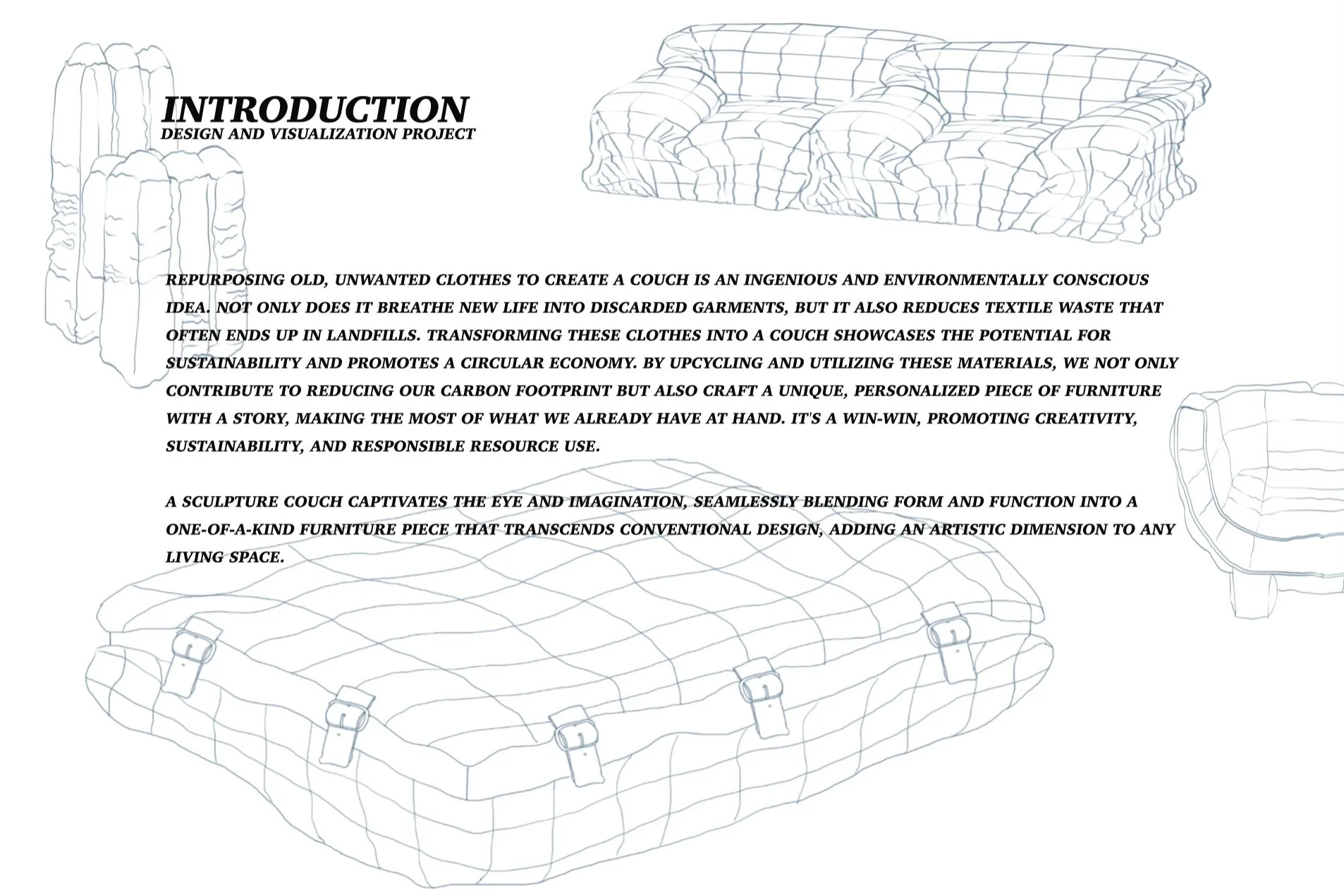 This project explores sustainable design through the creation of a sculptural couch made entirely from repurposed, discarded clothing. The concept was driven by the desire to address textile waste and environmental impact while embracing creativity and storytelling in furniture design.By transforming unwanted garments into a functional piece, this couch becomes more than just furniture it’s a statement on circular economy and responsible resource use. Every fold, seam, and contour is shaped with intention, capturing the tactile softness of fabric while emphasizing form and function.